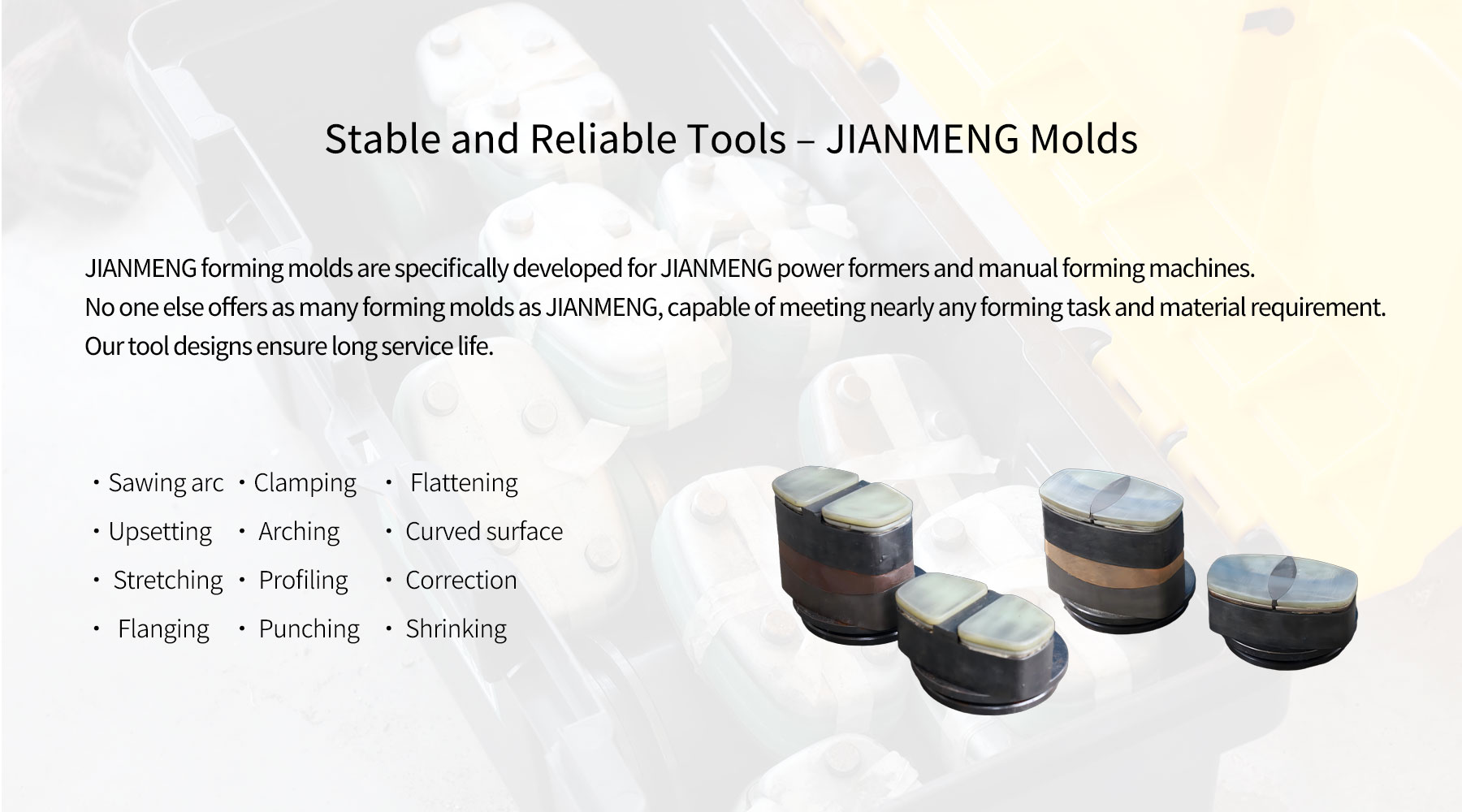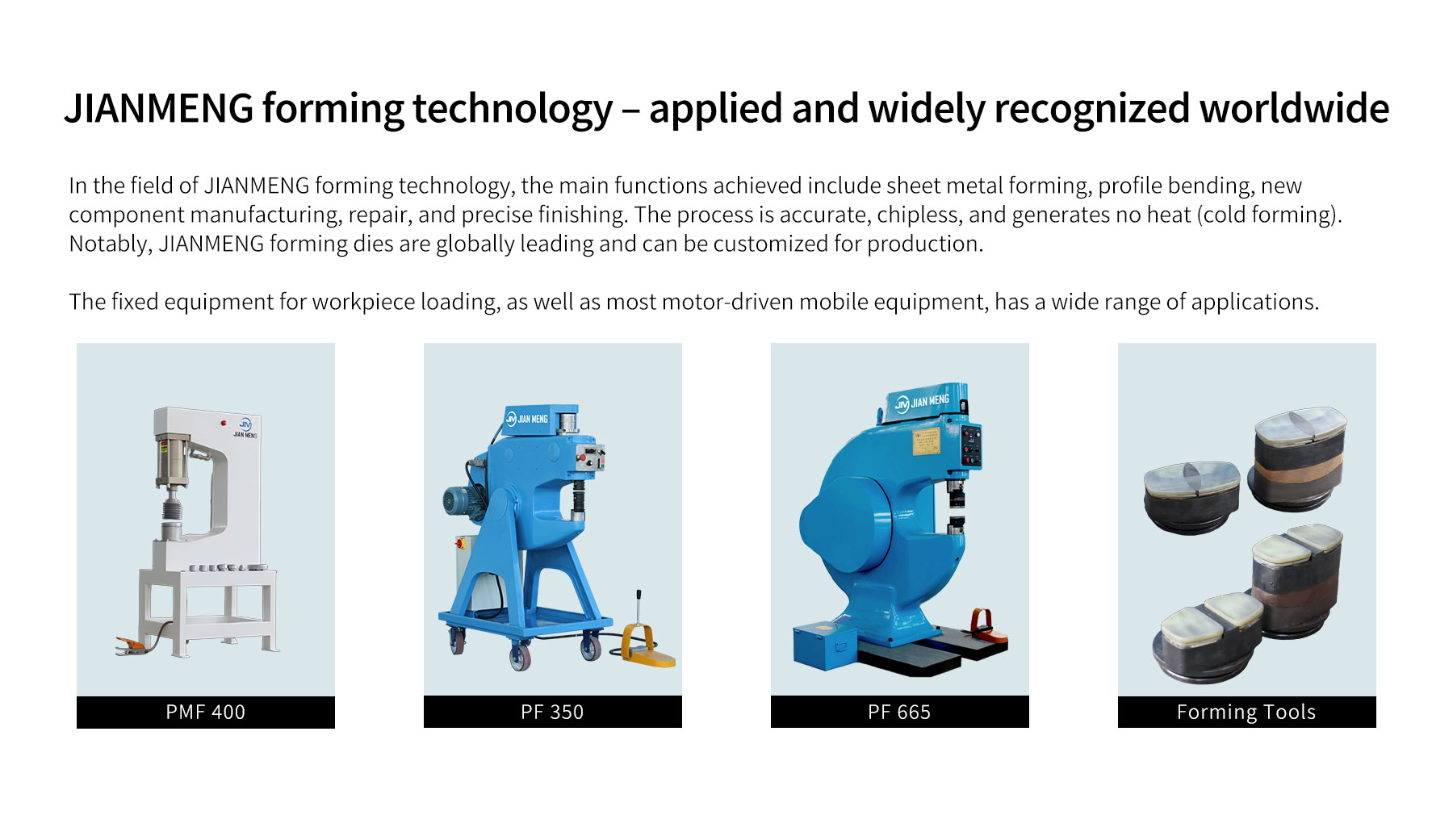 Технологията Jianmeng позволява прецизно, без чип студено формиране на метални листове и профили с минимален шум. Машината за формиране на Kraftformer може да се използва за профили на огъване, формиране на метални листове, производство на нови части, както и ремонт и прецизно коригиране на компоненти. Машината е оборудвана с различни инструменти, които могат да бъдат инсталирани и заменени в рамките на секунди, за да се адаптират към различни задачи. Тази интелигентна технология Jianmeng е водеща в световен мащаб.